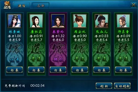 界面左下角显示免费刷新倒计时,每小时赠送一次刷新将领机会。冷却结束应立即使用。每次刷新呈现六名随机将领。冷却期间消耗仙石或礼券亦可刷新。通常手动刷新数次即可获取蓝色及以上品质散仙。自动刷新支持设定目标品质与上限次数。重点观察散仙的“潜力”与“资质”,二者直接决定战力高低。